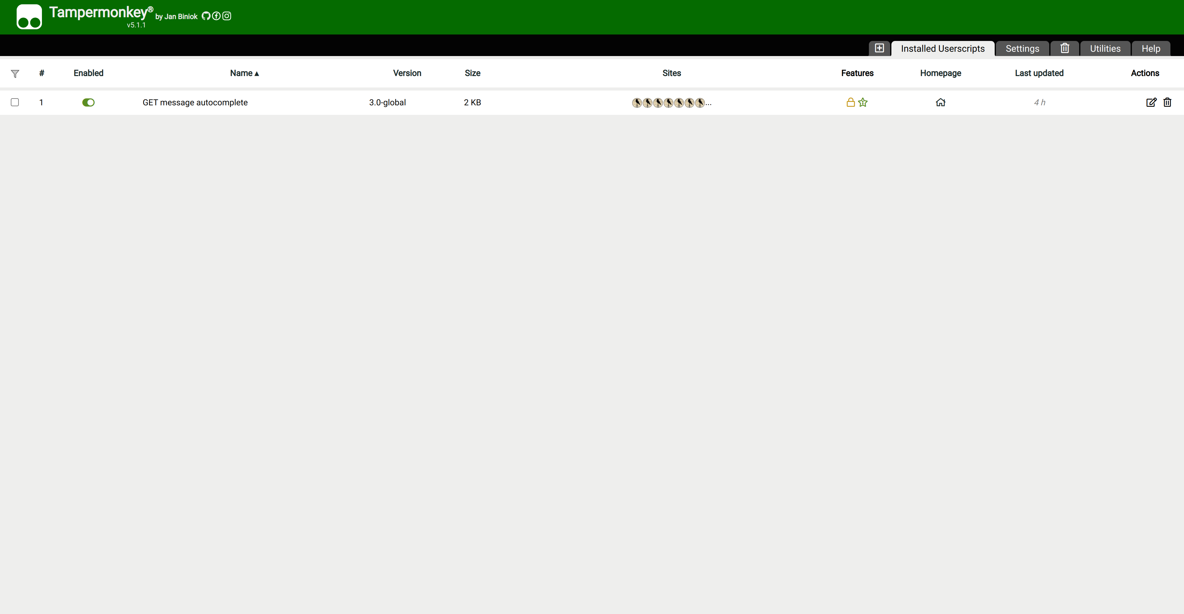 Stellen Sie sicher, dass die Tampermonkey-Erweiterung aktiviert ist und die Erweiterung "GET message autocomplete" aktiv ist.