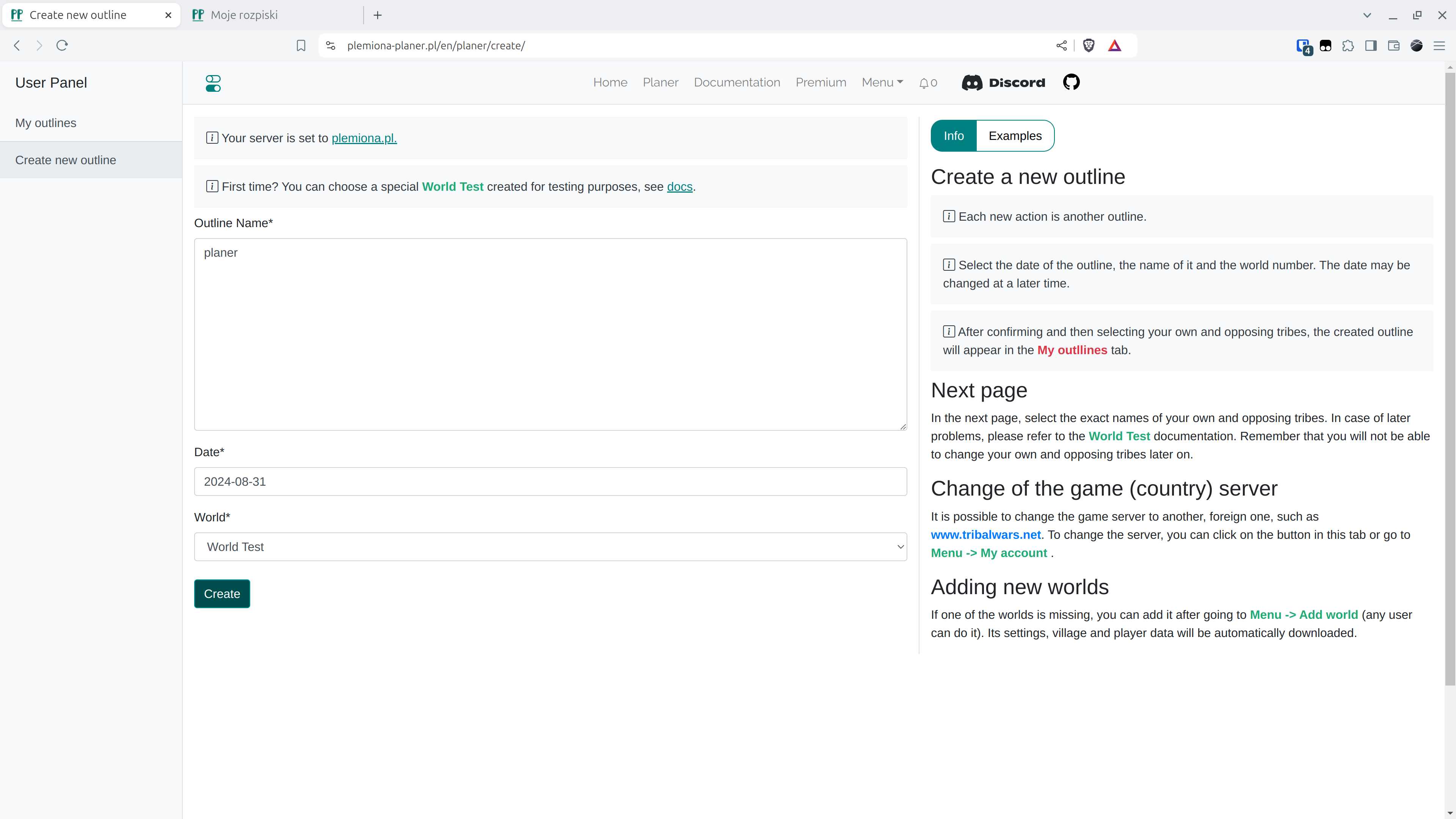 Depois de criar uma conta ou fazer login, você deve criar um novo plano em Criar novo plano, lembrando que o mundo do jogo selecionado deve ser o mundo de teste. Na versão atual, a data pode ser alterada livremente em um momento posterior.